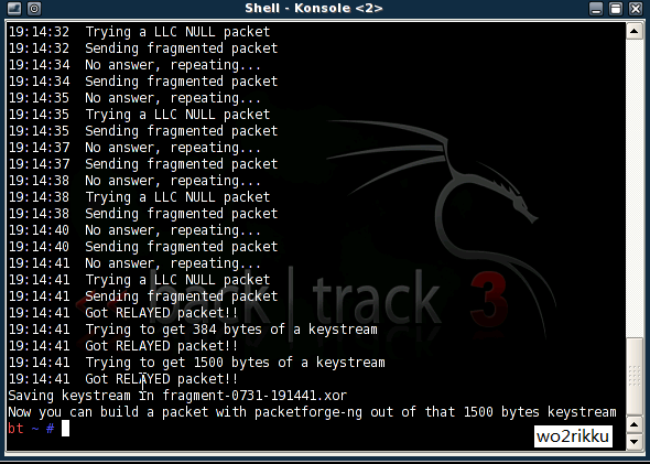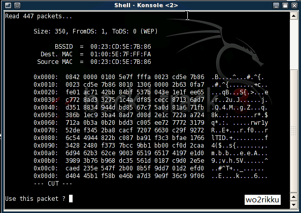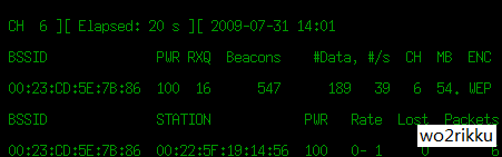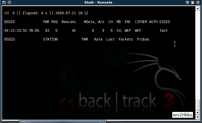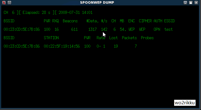 上图中我们可以得到很多消息。首先是data开始增长了,但是速度并不快。最后一行我们可以看见有客户端了,这是我进行假连的网卡。在rate一栏,我们可以看到是0-1,这表示并没有进行有效连接,而且数据传输很慢。如果以合法客户端连接的话,则会显示54-54(我的是54M无线路由)。