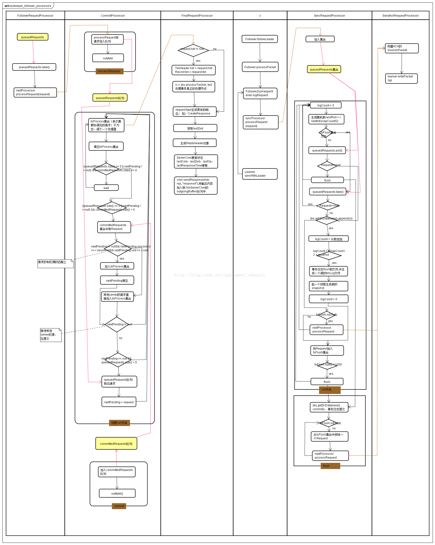 1. 下面就用一张图来说明Leader端的处理器链的交互过程  2. 下面就用一张图来说明Follower(Observer类似)端的处理器链的交互过程